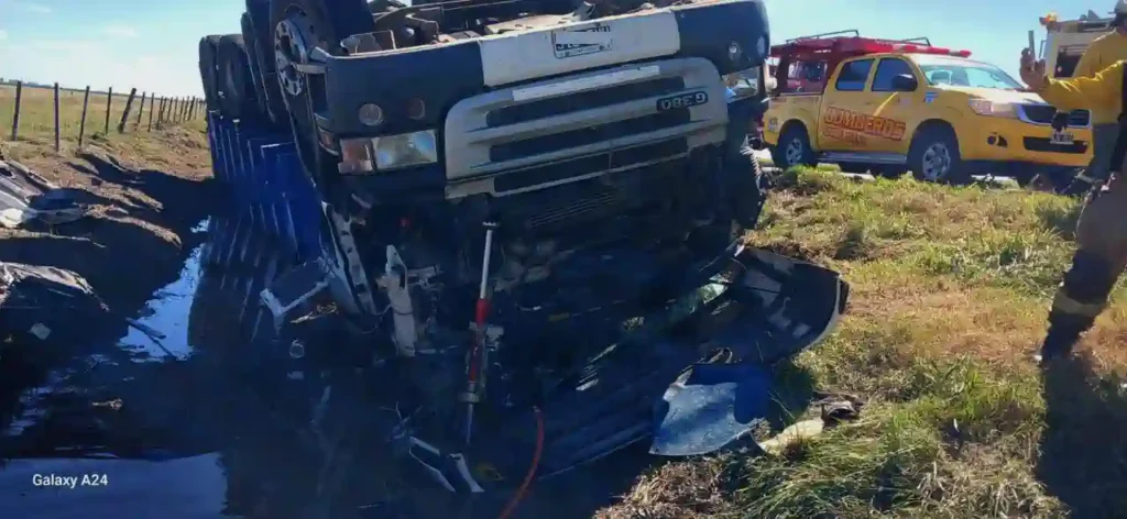 Al arribar, encontraron un camión (batea) cargado con piedra tumbado sobre la cuneta. El conductor, único ocupante, presentaba atrapamiento mecánico.