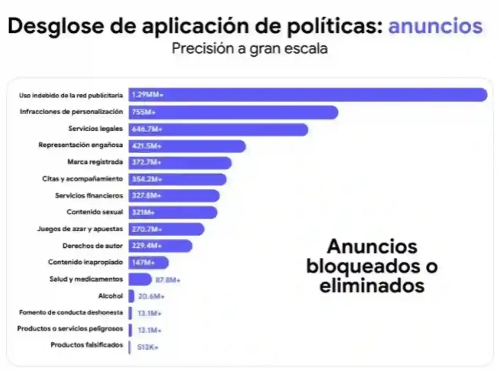 Entre los motivos más frecuentes de bloqueo se destacó el uso indebido de la red publicitaria, con más de 1.290 millones de anuncios eliminados.