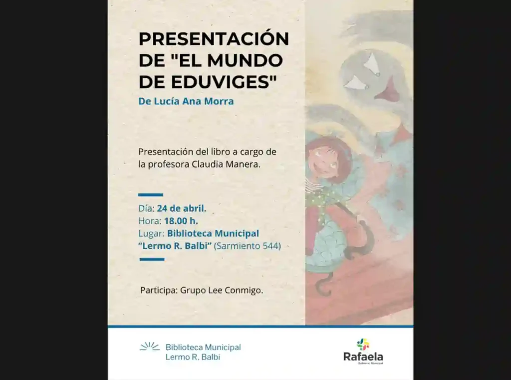 La Municipalidad de Rafaela,a través de la Secretaría de Educación y Cultura invita a toda la comunidad a la presentación de la obra literaria titulada «El Mundo de Eduviges», de la autora Lucía Ana Morra.