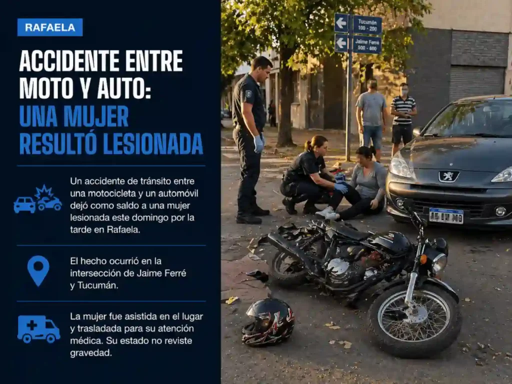 Un accidente de tránsito entre una motocicleta y un automóvil dejó como saldo a una mujer lesionada este domingo por la tarde en Rafaela. El hecho ocurrió en la intersección de Jaime Ferré y Tucumán.