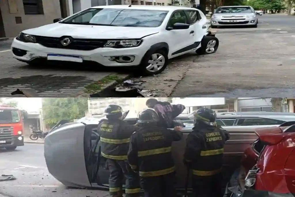 Según las primeras informaciones, un Toyota Innova perdió el control, impactó contra dos vehículos estacionados —un Renault Kwid blanco y un Toyota Etios rojo— y terminó volcado sobre la calzada.